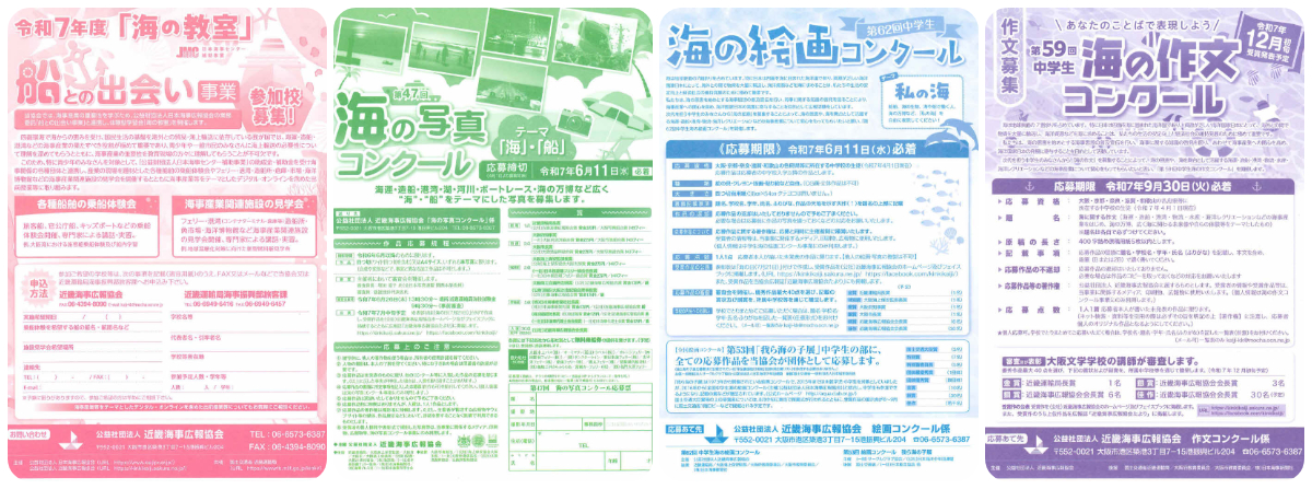 中学生海の作文コンクール- 海の絵画コンクール同様、次世代を担う中学生に、海や船に対する関心を深めていただくため、近畿運輸局、大阪府教育委員会、大阪市教育委員会、㈱日本海事新聞社の後援を得て、海や船など広く海にかかわるものを題材とする作文を募集しています。